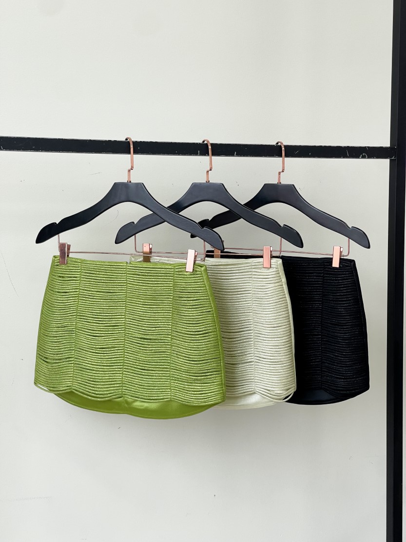A mini saia Marítimo traz um trabalho sofisticado em Handmade, com camadas de tiras spaghetes, confeccionada na Alfaiataria sunshine com micro brilhos em sua trama, forro acetinado, fechamento nas parte posterior por zíper.