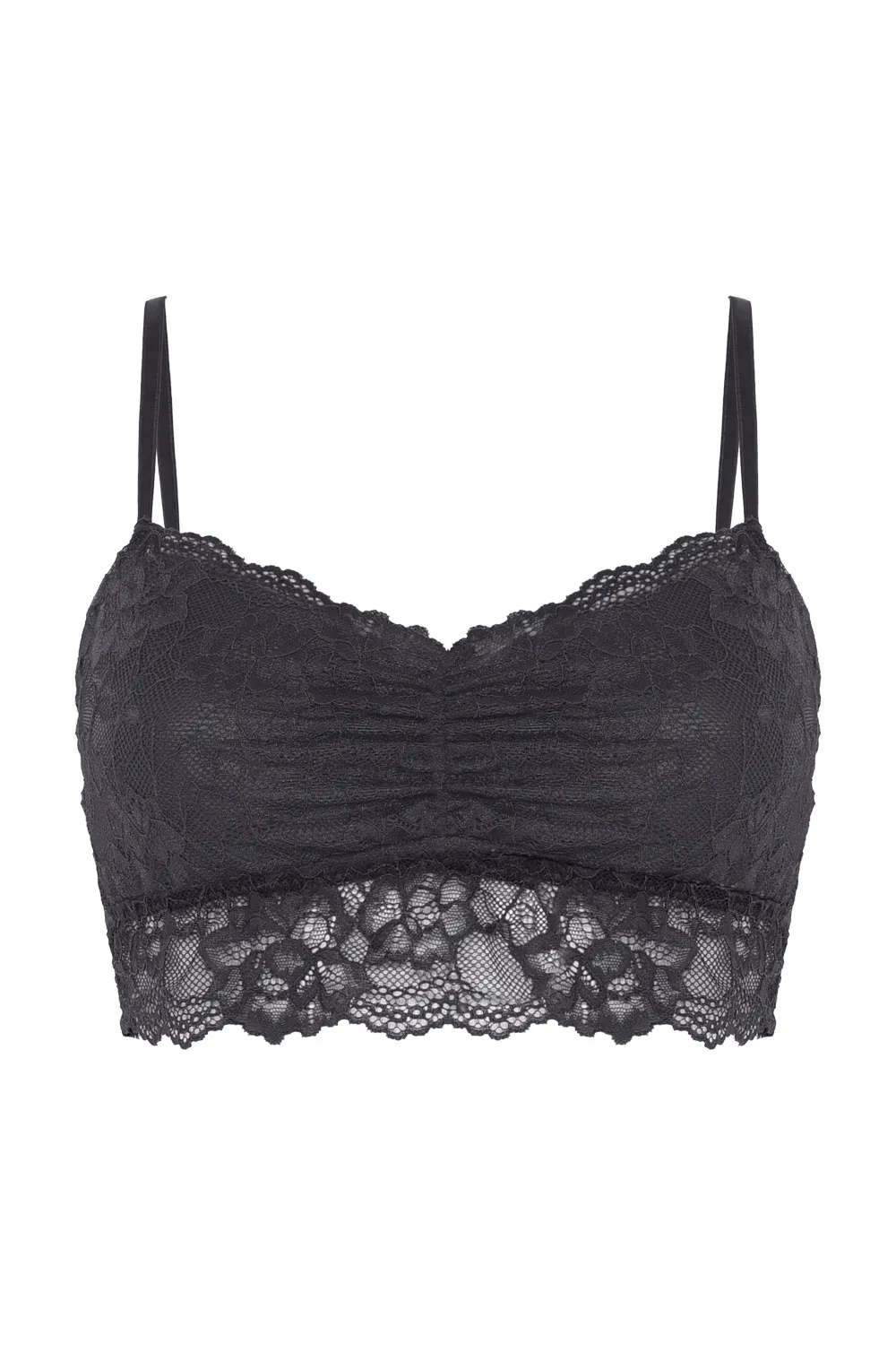 Top de renda com aviamento em V no busto e elástico finos nas costas.