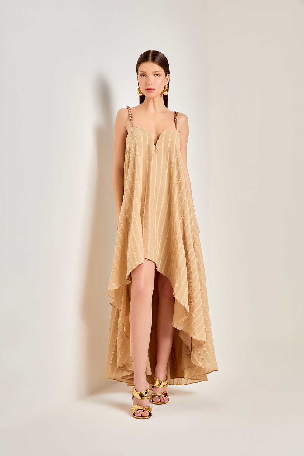 Esse vestido de chiffon possui listras de brilho, alças feitas de cordão brilhante e um detalhe de macramê na parte frontal. O decote tem um detalhe em V, e as alças possuem amarração nas costas, proporcionando um ajuste personalizado. O comprimento mullet, que é mais curto na frente e mais longo atrás, confere um visual elegante e moderno, ideal para eventos formais como casamentos e festas noturnas.