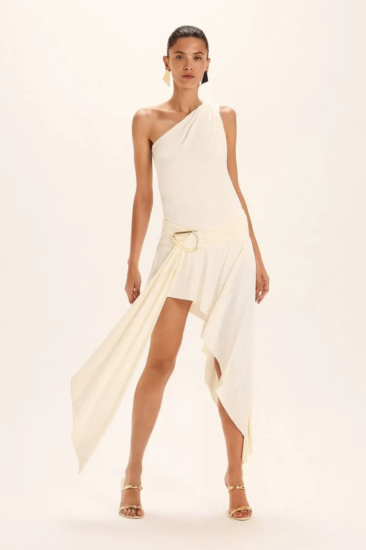 Vestido em malha poliamida com modelagem ombro só e cava levemente aprofundada na lateral, criando um caimento elegante e moderno. A saia conta com shortinho embutido estilo body para conforto e segurança.Sofisticação assimétrica com detalhes funcionais.